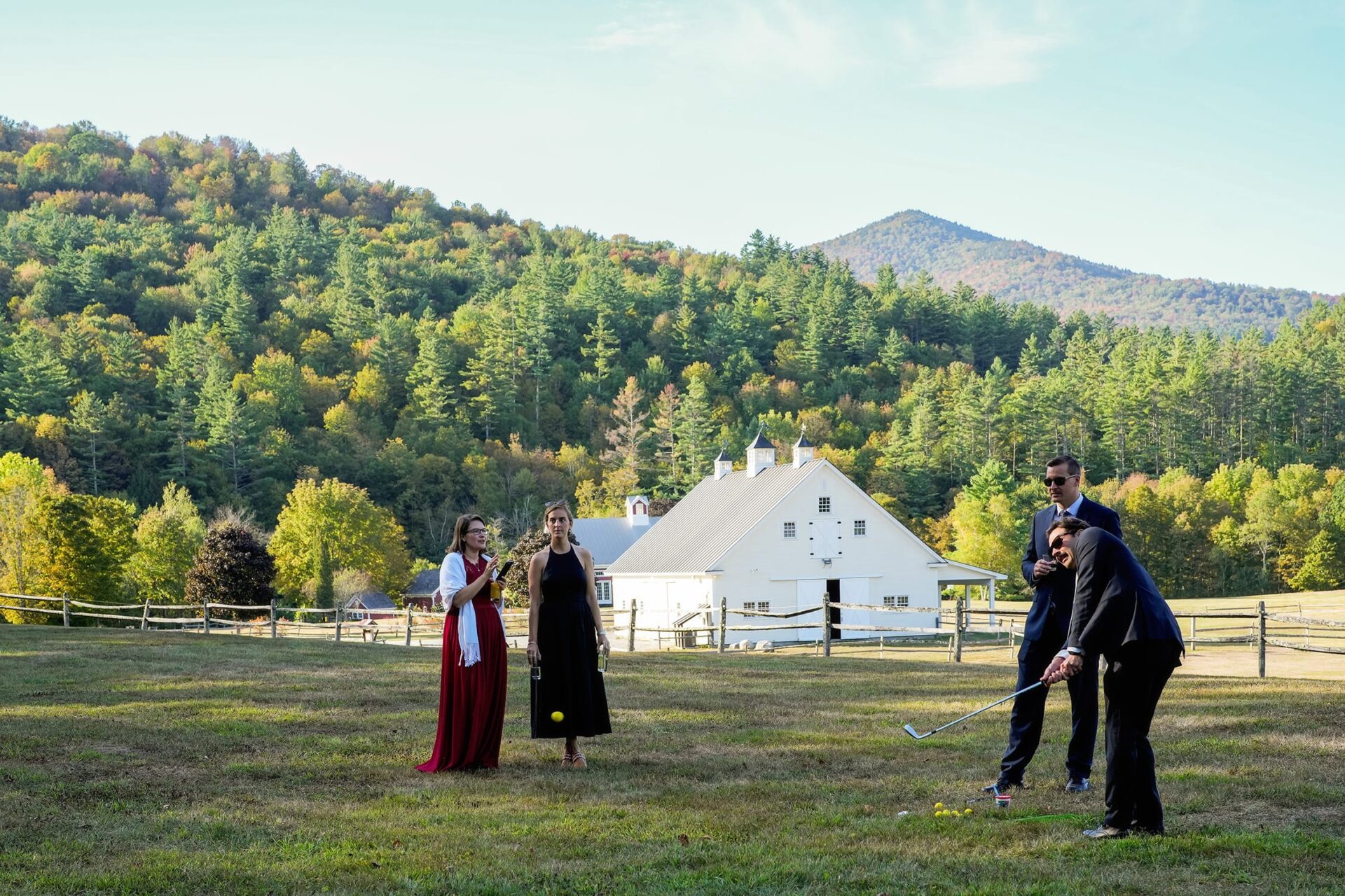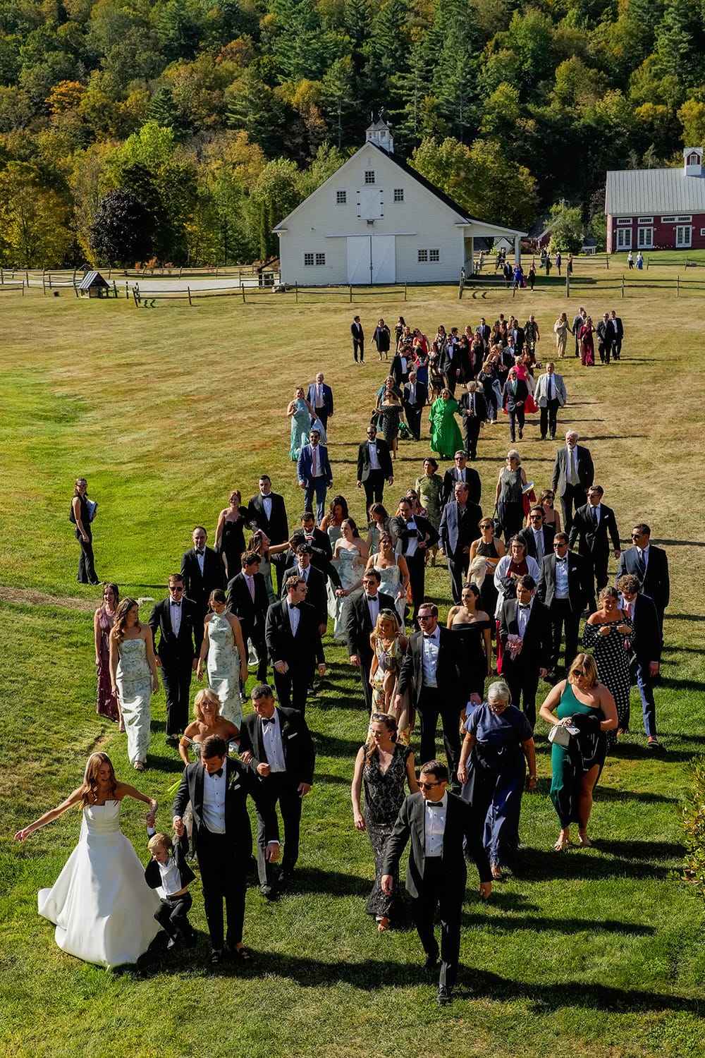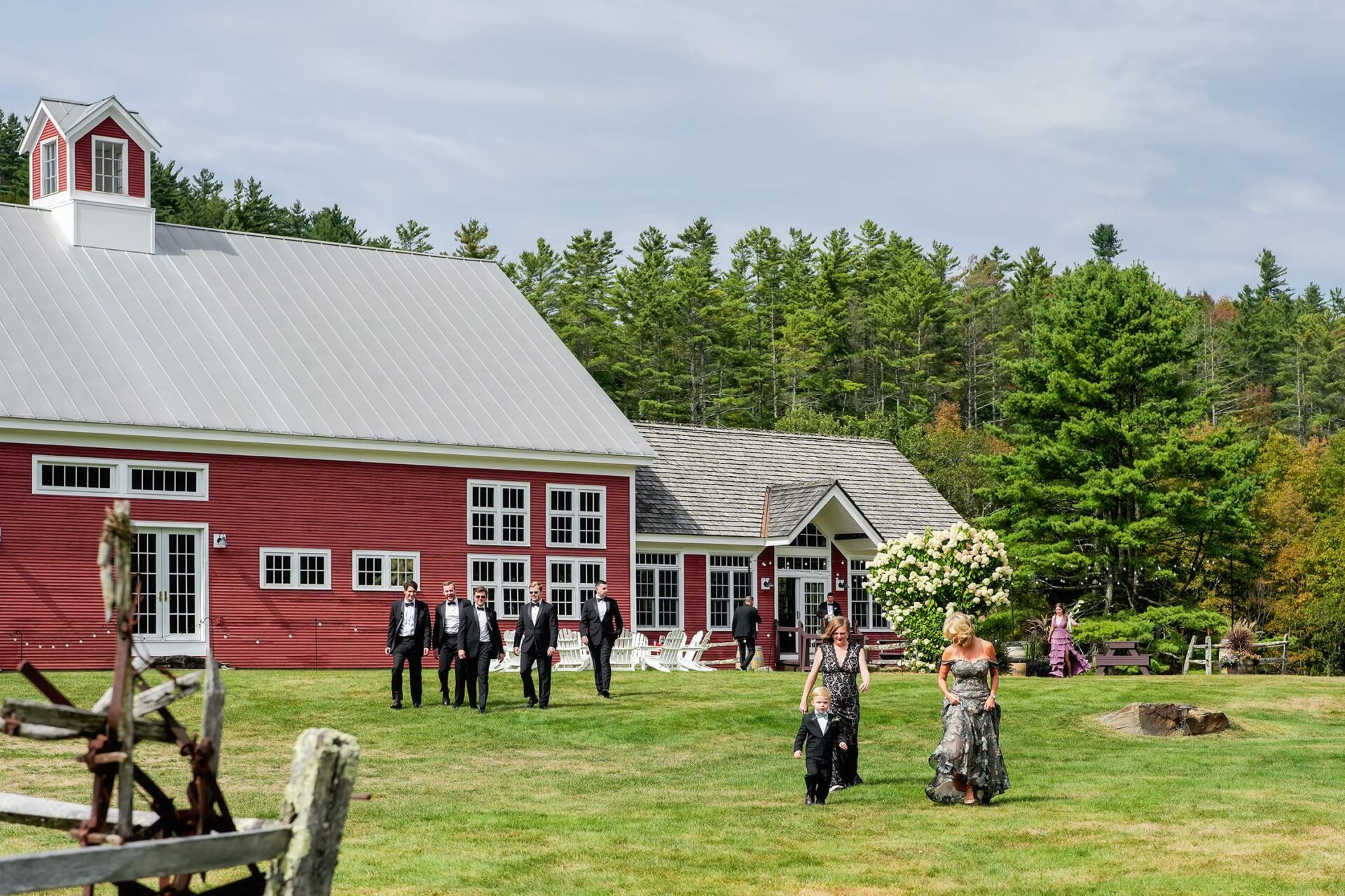 wedding ceremony at riverside farm in Vermont with the red barn in the background