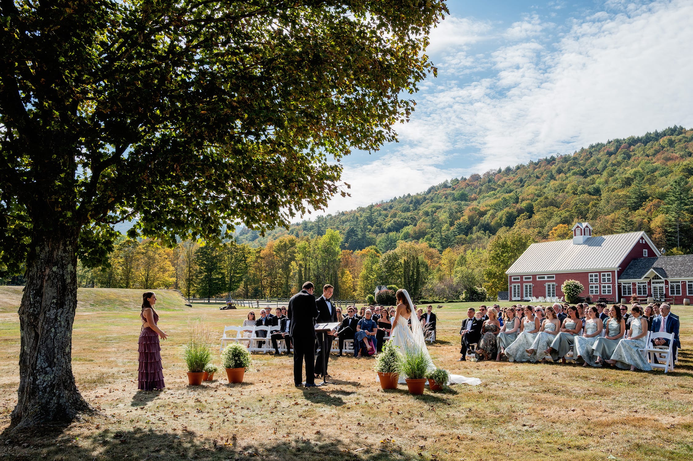 wedding ceremony at riverside farm in Vermont with the red barn in the background